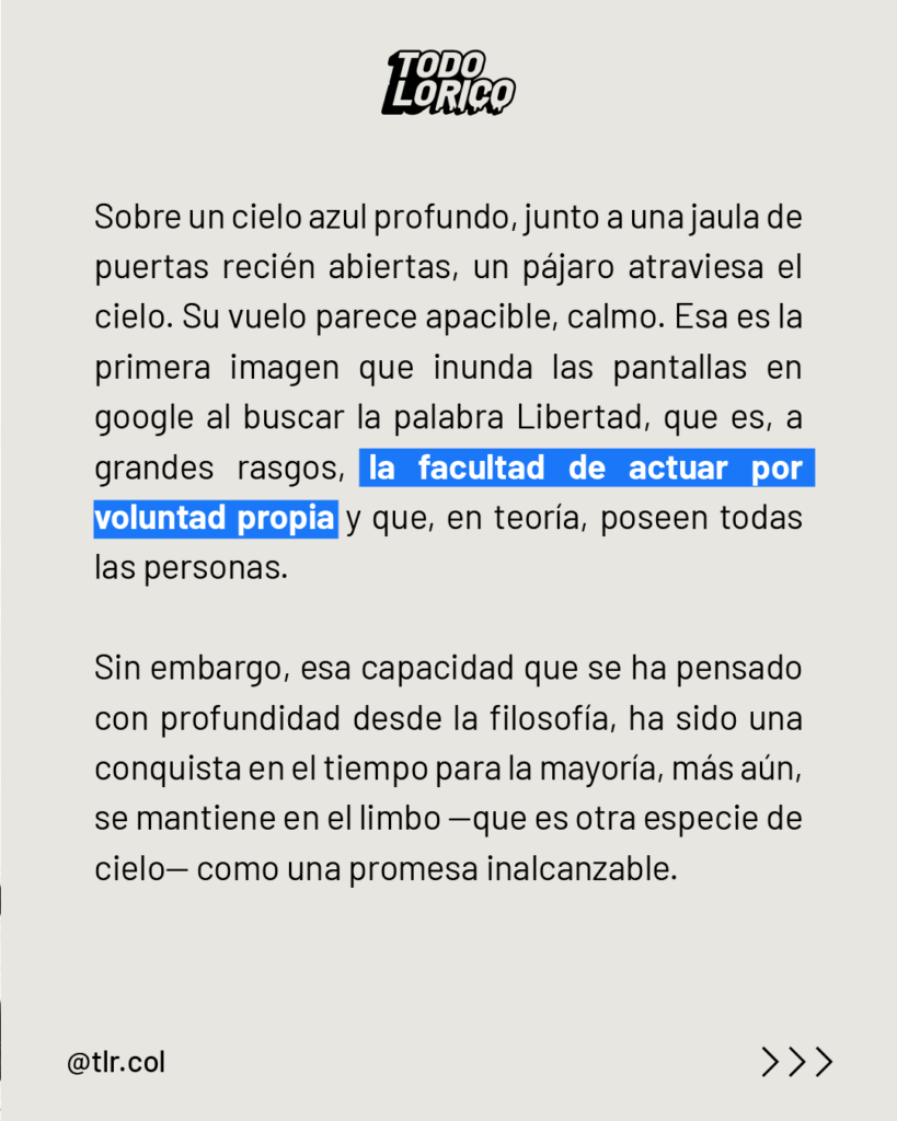 Sobre un cielo azul profundo, junto a una jaula de puertas recién abiertas, un pájaro atraviesa el cielo. Su vuelo parece apacible, calmo. Esa es la primera imagen que inunda las pantallas en google al buscar la palabra Libertad, que es, a grandes rasgos, la facultad de actuar por voluntad propia y que, en teoría, poseen todas las personas.
