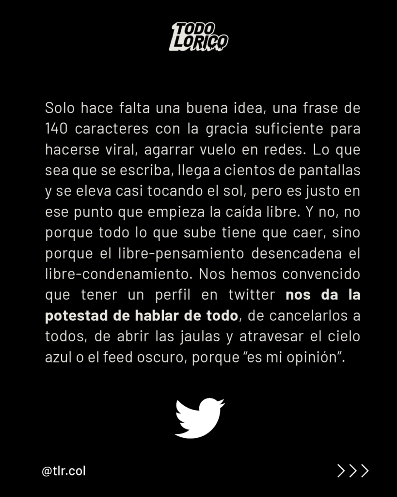 Solo hace falta una buena idea, una frase de 140 caracteres con la gracia suficiente para hacerse viral, agarrar vuelo en redes. Lo que sea que se escriba, llega a cientos de pantallas y se eleva casi tocando el sol, pero es justo en ese punto que empieza la caída libre. Y no, no porque todo lo que sube tiene que caer, sino porque el libre-pensamiento desencadena el libre-condenamiento. Nos hemos convencido que tener un perfil en twitter nos da la potestad de hablar de todo, de cancelarlos a todos, de abrir las jaulas y atravesar el cielo azul o el feed oscuro, porque “es mi opinión”.