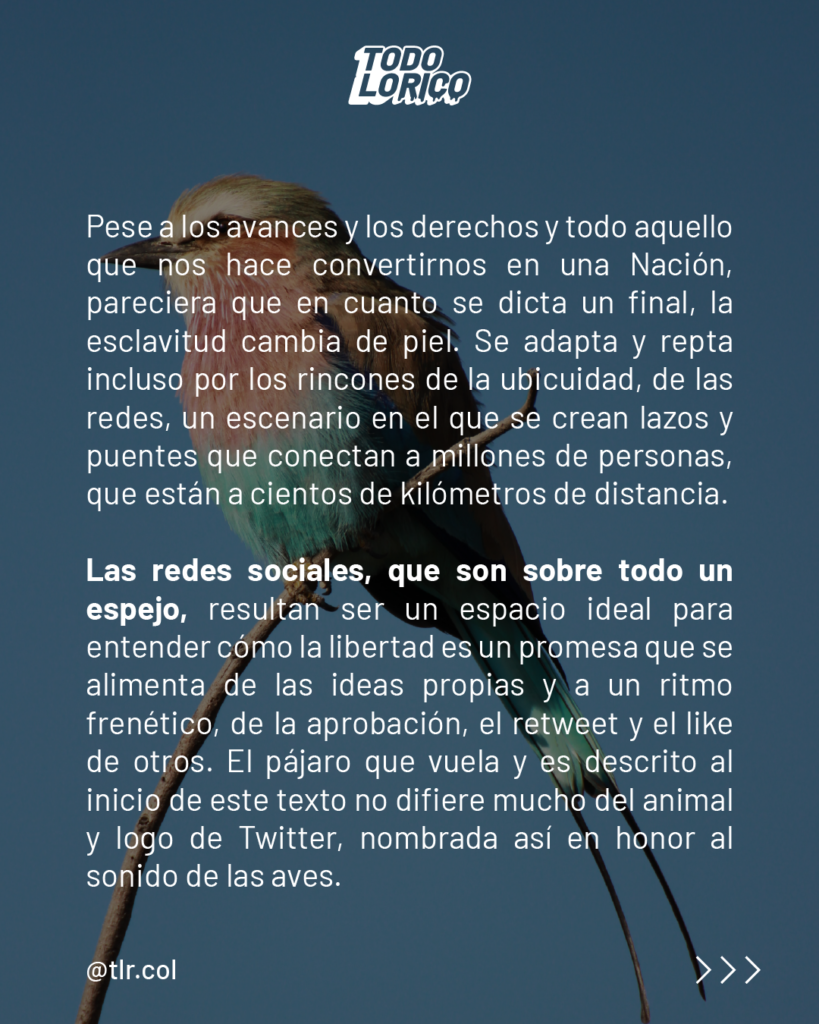 Las redes sociales, que son sobre todo un espejo, resultan ser un espacio ideal para entender cómo la libertad es un promesa que se alimenta de las ideas propias y a un ritmo frenético, de la aprobación, el retweet y el like de otros. El pájaro que vuela y es descrito al inicio de este texto no difiere mucho del animal y logo de Twitter, nombrada así en honor al sonido de las aves.