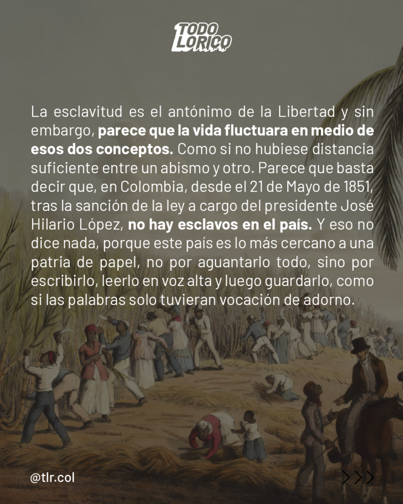 La esclavitud es el antónimo de la Libertad y sin embargo, parece que la vida fluctuara en medio de esos dos conceptos. Como si no hubiese distancia suficiente entre un abismo y otro. Parece que basta decir que, en Colombia, desde el 21 de Mayo de 1851, tras la sanción de la ley a cargo del presidente José Hilario López, no hay esclavos en el país. Y eso no dice nada, porque este país es lo más cercano a una patria de papel, no por aguantarlo todo, sino por escribirlo, leerlo en voz alta y luego guardarlo, como si las palabras solo tuvieran vocación de adorno.
